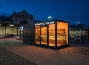 Kontener usługowy z przeszklenie – przestrzeń otwarta na klientów